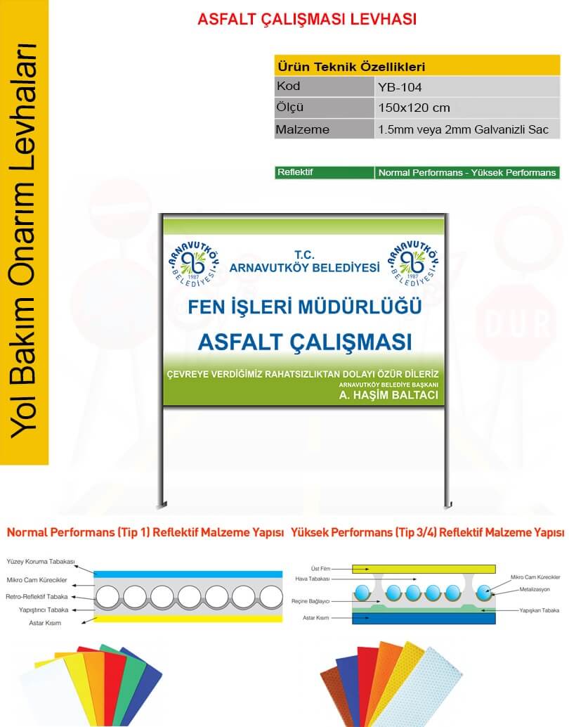 Belediye bilgilendirme tabelası: “Normal performans reflektif ve Yüksek performans reflektif ” malzeme ile üretilmiştir. Reflektif değerleri, yansıma oranlarını göstermektedir. Normal performans reflektif’te (Tip-1) kullanılmaktadır. Yüksek performans reflektif’te ise (Tip-4) malzeme kullanılmaktadır.