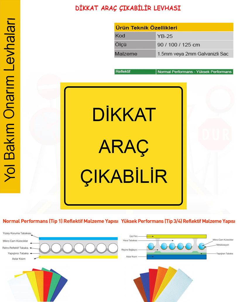 Dikkat araç çıkabilir tabelası: "Normal performans reflektif ve Yüksek performans reflektif " malzeme ile üretilmiştir. Reflektif değerleri, yansıma oranlarını göstermektedir. Normal performans reflektif'te (Tip-1) kullanılmaktadır. Yüksek performans reflektif'te ise (Tip-4) malzeme kullanılmaktadır.