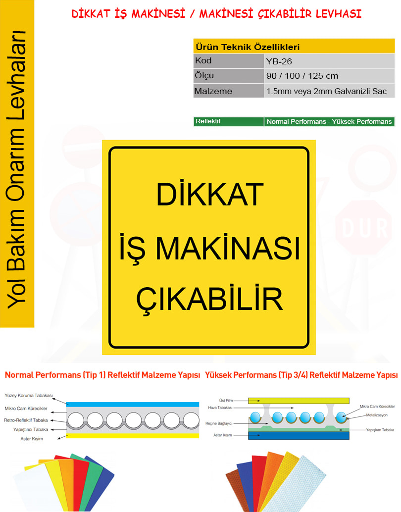 Dikkat iş makinesi çıkabilir tabelası: "Normal performans reflektif ve Yüksek performans reflektif " malzeme ile üretilmiştir. Reflektif değerleri, yansıma oranlarını göstermektedir. Normal performans reflektif'te (Tip-1) kullanılmaktadır. Yüksek performans reflektif'te ise (Tip-4) malzeme kullanılmaktadır.