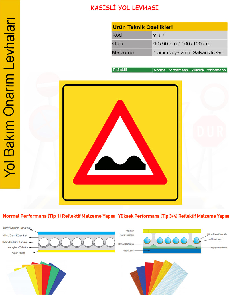 Kasisli yol tabelası: "Normal performans reflektif ve Yüksek performans reflektif " malzeme ile üretilmiştir. Reflektif değerleri, yansıma oranlarını göstermektedir. Normal performans reflektif'te (Tip-1) kullanılmaktadır. Yüksek performans reflektif'te ise (Tip-4) malzeme kullanılmaktadır. Uzun yıllar zorlu hava koşullarına dayanıklıdır ve renklerini kaybetmez.